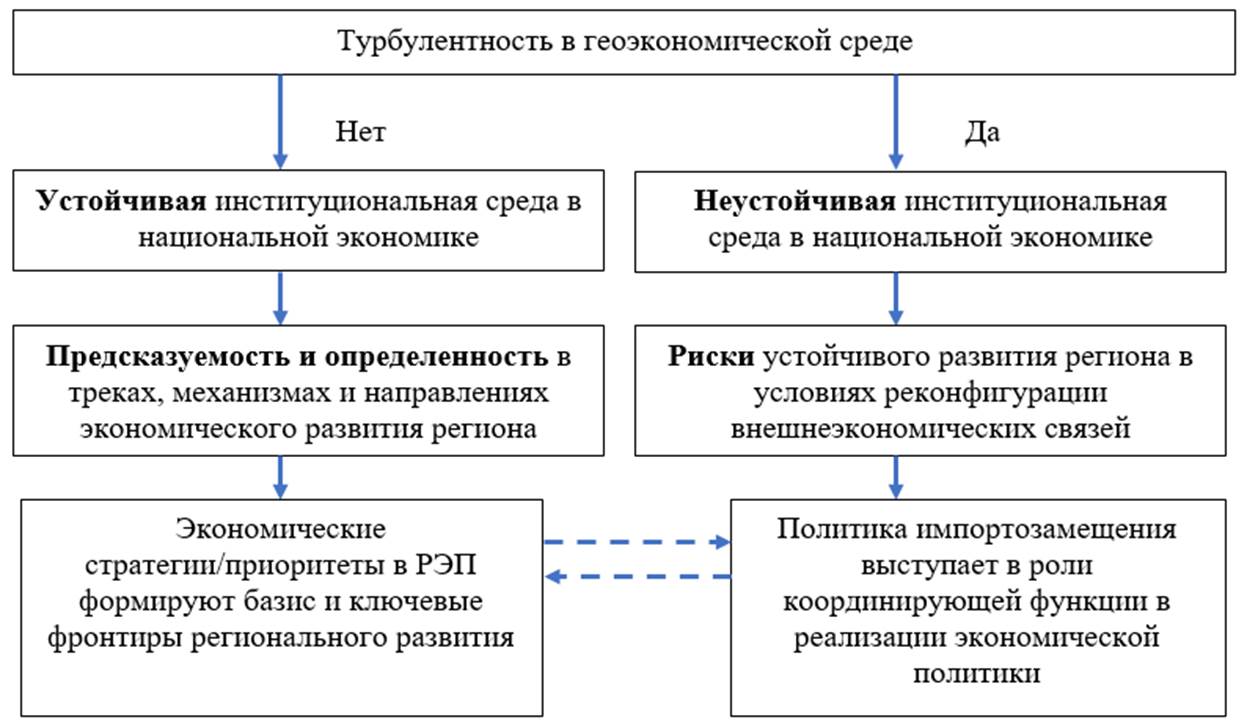 Важно подчеркнуть, что обособление политики импортозамещения обусловлена тем, что она реализуется в русле конъюнктурных или фундаментальных изменений и может ситуативно интегрироваться в фарватер реализации общих стратегических ориентиров региона. Другими словами, политика импортозамещения выступает в роли сопутствующего элемента, встроенного в единый каркас региональных социально-экономических стратегий. Ее активизация или консервация в системе РЭП сопровождается соответствующими изменениями в экономической политике региона, формируемая в русле трансформации геополитической повестки. И наоборот, траектории реализации экономической политики определяют направления импортозамещения, что в очередной раз подтверждает тезис о том, что данные две составляющие РЭП являются взаимосвязанными и взаимодополняющими друг друга. Вопрос о том, какая из них является главенствующей с точки зрения определения импульсов формирования каждой из них является не тривиальным. С одной стороны, траектории реализации экономической политики выступают в роли координирующего вектора осуществления мероприятий в сфере импортозамещения. С другой стороны, в условиях нестабильной внешней среды, запускающей импульсы формирования государственных стратегий во внешнеэкономической деятельности, политика импортозамещения может стать во многом определяющей направления экономической политики. Другими словами, главенствующая роль каждой из них определяется динамично трансформирующимися условиями в институциональной среде во внешнем и внутреннем контуре. В случае турбулентности на внешних рынках происходит коррекция институциональных надстроек развития экономических систем, что, в свою очередь, предопределяет активизацию и возможную реконфигурацию политики импортозамещения. Это, соответствующим образом отражается на параметрах реализации экономической политики. Региональная политика импортозамещения становится главенствующей надстройкой в РЭП. Таким образом можно обоснованно предположить, что в условиях нестабильной внешнеэкономической конъюнктуры, запускающей механизмы институционального развития, политика импортозамещения выступает в роли фронтира, запускающего и корректирующего экономические треки развития, включая промышленный и финансовый направляющие. В условиях же стабильной макроэкономической среды, экономическая политика, направленная на структурное развитие экономики и обеспечение ее глобальной конкурентоспособности, определяет базис для реализации политики импортозамещения. В контексте региональных особенностей развития, данная концепция также является обоснованной, поскольку регионы, формируя программы своего социально-экономического роста, отталкиваются от фундаментальных факторов, корректирующих соответствующим образом собственные, адаптированные под структурные особенности региона, треки в политике импортозамещения и экономическом развитии.