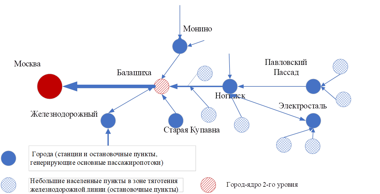 Функционирование транспортной системы определяет качество жизни населения и социально-экономическое развитие территории. Системы транспортного обслуживания городских агломераций включают (1) модель управления и организации транспортного обслуживания населения; (2) маршрутную сеть; (3) подвижной состав пассажирского транспорта; (4) инфраструктуру пассажирского транспорта; (5) интеллектуальную транспортную систему [8]. Вопросы развития транспортной системы в целом и по каждому элементу в отдельности для ядер 1-го уровня агломераций достаточно хорошо исследованы. На этапе становления городских транспортных систем проблемы и пути их решения отражены в научных работах Зильберталя А.Х. [4] (Zilbertal, 1937), Шелейховского Г.В. [21] (Sheleykhovskiy, 1946), Якшина А.М. [22] (Yakshin, 1946), Полякова А.А. [13] (Polyakov, 1953). Работы этих ученых стали основой для планирования и развития маршрутно-транспортной сети городов в целом. По мере роста числа личных автомобилей в конце XX – начале XXI века разрастались пригородные зоны крупных городов, а дорожное строительство стало двигателем экономического развития. При этом транспортная инфраструктура не справлялась с нагрузкой, условия проживания жителей ухудшались из-за высокого уровня загазованности, повышения уровня шума от транспорта, потери времени в пробках. Для снижения негативного влияния потоков автомобилей и с целью реализации клиентоориентированной концепции развития транспортной инфраструктуры основными направлениями научных исследований в начале XXI века стали вопросы интеграции транспортной политики с градостроительной политикой, изучение спроса на пассажирские перевозки, технико-экономическое обоснование развития пассажирской инфраструктуры, оптимизация маршрутной сети и расписания, повышение качества транспортных услуг [7, 24, 10, 23] (Asaliev et al., 2016; Fang et al., 2008; Andreev et al., 2019).