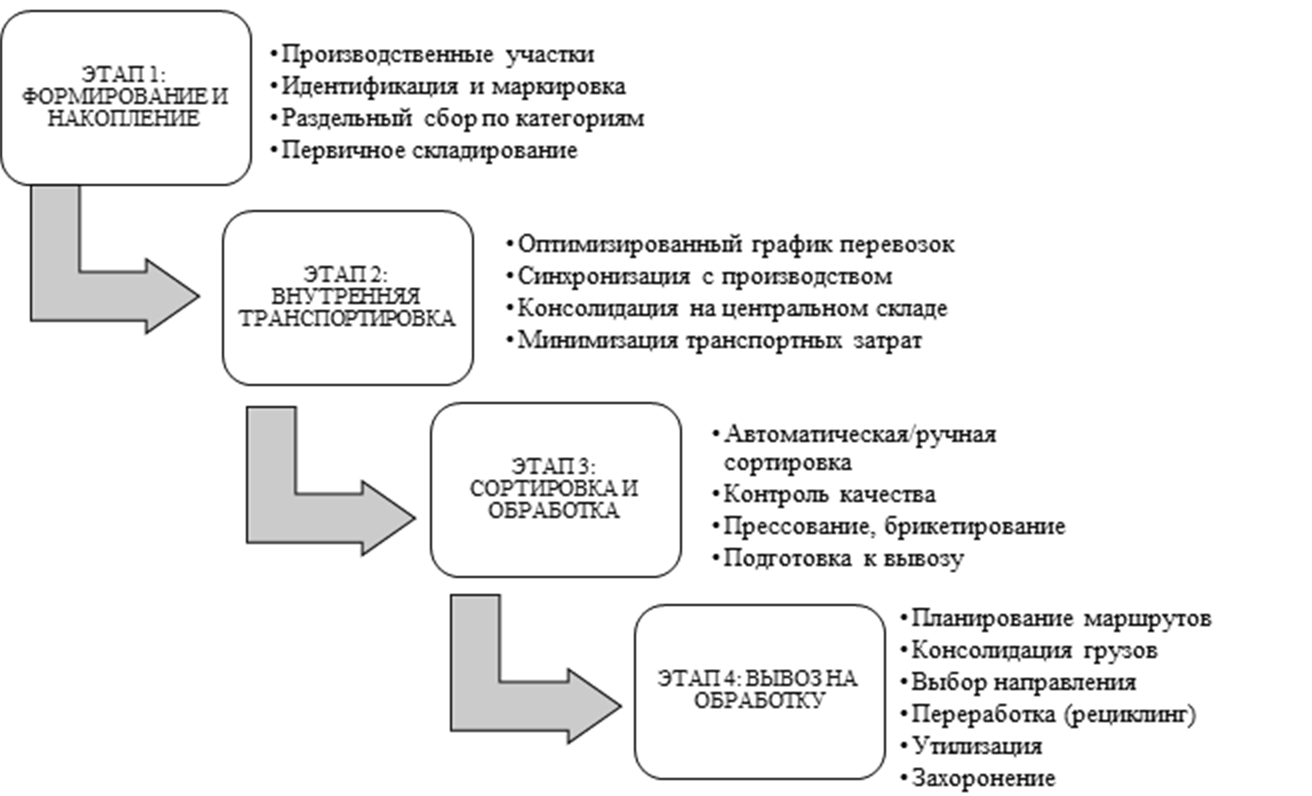 Логистическая цепочка вывоза отходов включает последовательность этапов, каждый из которых требует детального процессного описания и координации с другими бизнес‑процессами предприятия (рис. 1).