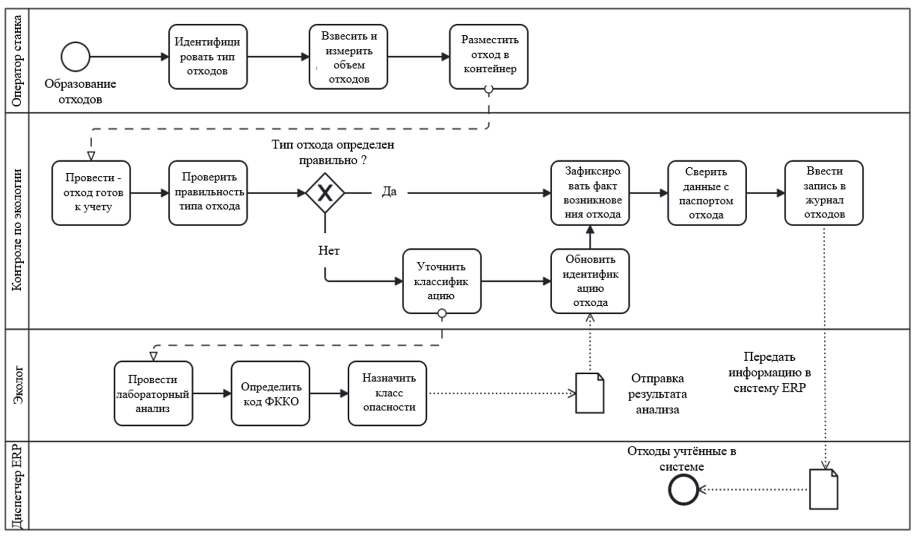 Данный подпроцесс инициируется событием «образование отхода в результате технологической операции» и включает задачи идентификации типа отхода, его взвешивания или измерения объема, маркировки контейнера и регистрации в учетной системе. На BPMN‑диаграмме этот процесс представлен с использованием дорожек для разграничения ответственности (рис. 3):