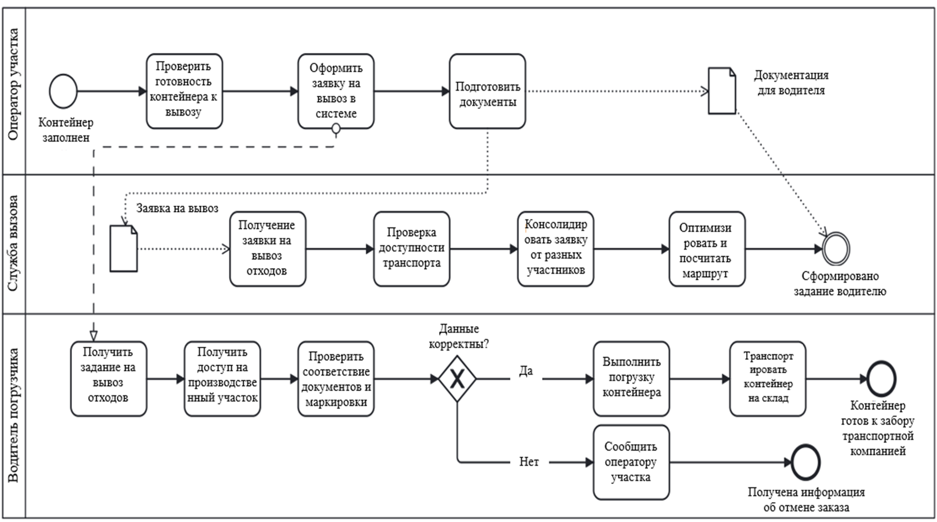 Этот подпроцесс запускается промежуточным событием «Контейнер на участке заполнен отходами». Ключевой особенностью данного подпроцесса является необходимость координации между несколькими участниками: внутренним и внешним транспортом и центральным складом отходов.