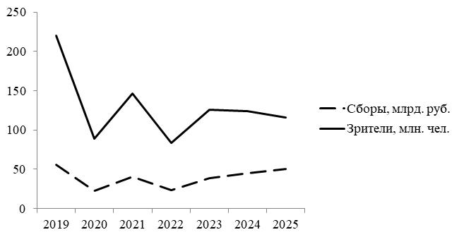 Рис. 1. Динамика кинотеатрального рынка России, 2019-2025 гг.