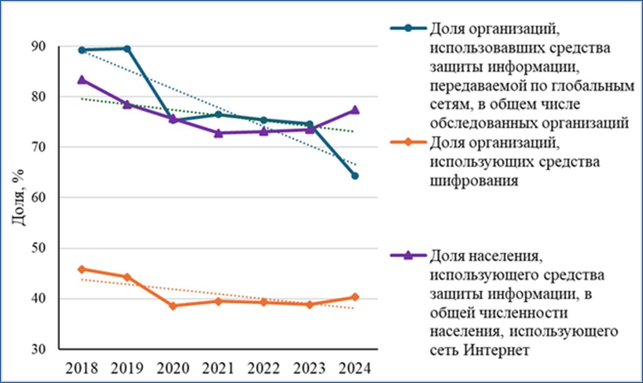 Использование ИИ требует особого внимания к обеспечению безопасности, что связано с рисками утечки персональных данных и нарушением конфиденциальности. Несмотря на это, организации и население демонстрируют отрицательный тренд в использовании средств защиты информации (рис. 3).