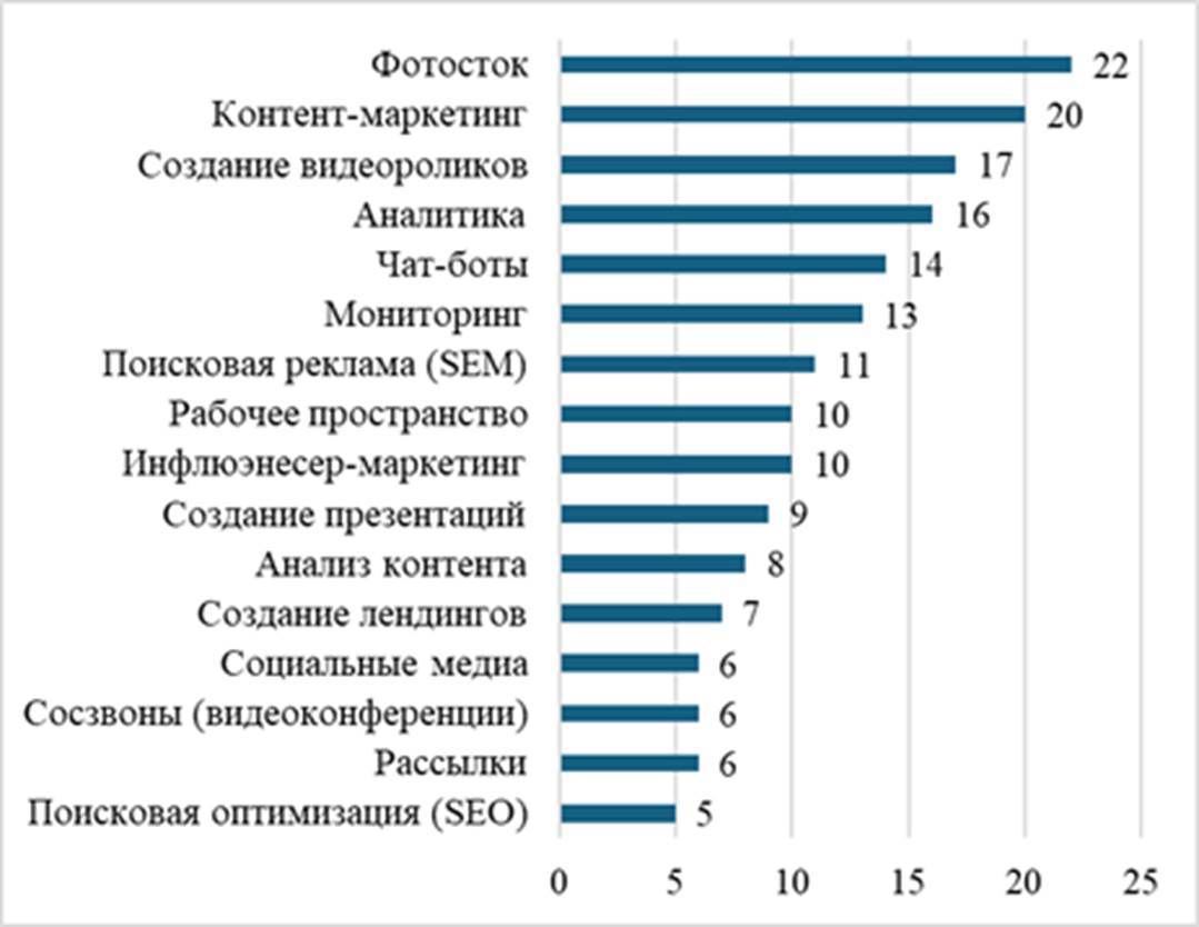 Более 40% рекламодателей используют от 4 до 6 цифровых сервисов, а 18% − 7–10 сервисов для продвижения товаров и/услуг в Интернет с получением измеримого результата (клики, покупки, регистрация на сайте, заказ, звонки и др.) [5] (Veretyokhin, 2022). Эти данные свидетельствуют о необходимости подготовки специалистов в области цифровой рекламы с учетом развивающихся сервисов цифровой рекламы. К таким сервисам в первую очередь относятся специализированные ИТ-решения, в том числе: