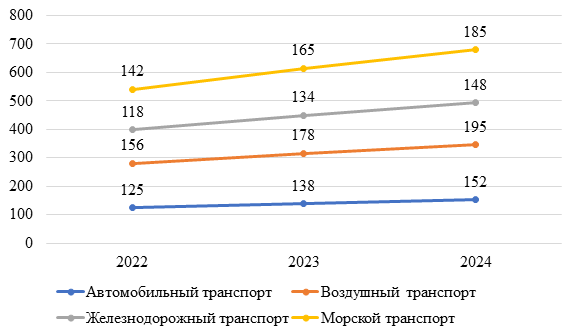 Парадоксальность текущего этапа проявляется в очевидном диссонансе между стремительным ростом издержек и сохраняющимися объемами перевозок. Так, по данным статистики, в 2022 году общий объем грузоперевозок в России увеличился на 6.2%, достигнув 8.8 млрд тонн, что превышает показатели докризисного 2019 года [7]. Эта динамика стала прямым следствием масштабной переориентации товарных потоков: смещения экспорта на восточное и южное направления, а также активного перевода импорта на железнодорожный и автомобильный транспорт. Данная трансформация, однако, сопровождается нарастанием системных барьеров и рисков.
