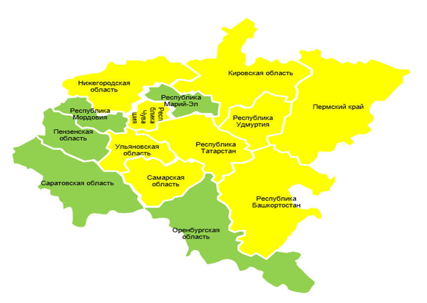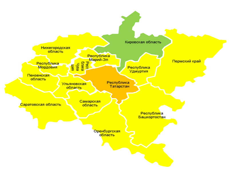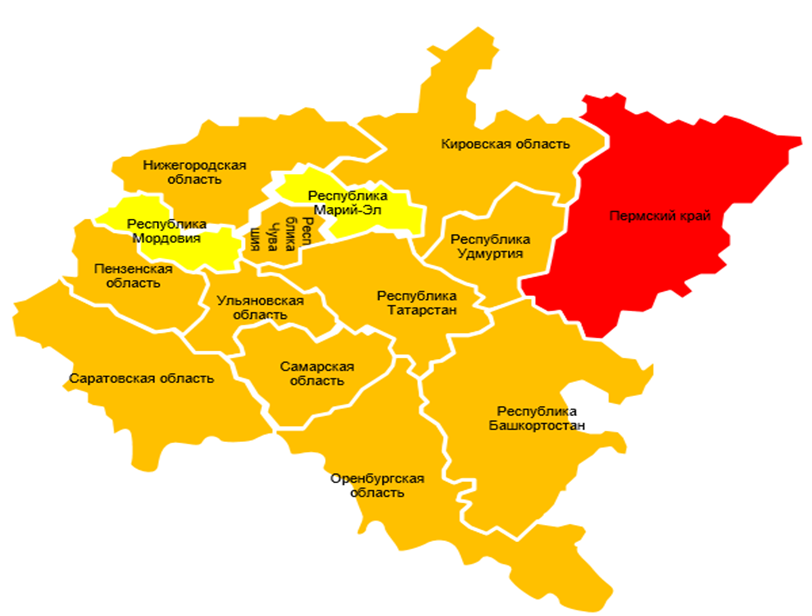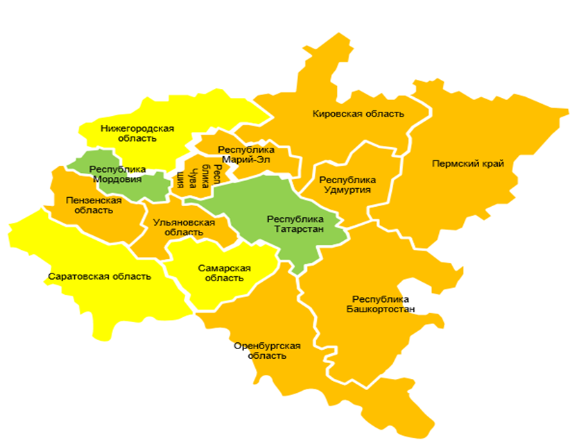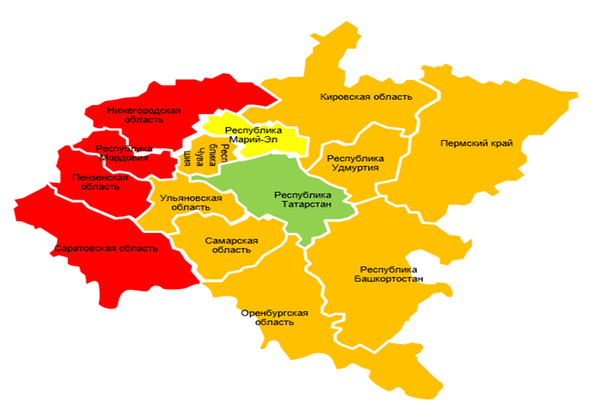Регионы ПФО преимущественно расположились в предкризисном уровне риска (9 субъектов РФ). Три субъекта находятся в допустимом уровне – Нижегородская (0,782), Саратовская (0,781) и Самарская (0,779) области.