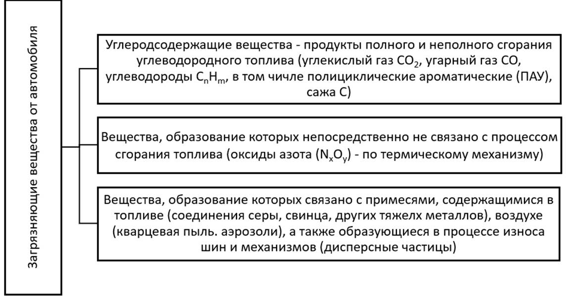 Выбросы в выхлопных газах автотранспорта содержат более 300 вредных веществ. Конкретный состав выхлопных газов транспортных средств зависит от множества факторов. Основные факторы – это вид топлива (дизельное, бензин (разное октановое число), газомоторное топливо (компримированный природный газ, сжиженный природный газ, пропан-бутан), смешанные варианты топлива, биотопливо и др.); тип двигателя; техническое состояние двигателя (пробег, часы работы, режимы работы и др.); реальное качество топлива; сезон эксплуатации и др. Сегодня далеко не все составы выхлопных газов изучены, тем не менее в ходе различных испытаний ДВС (пробеговых и на стендах) определены химические вещества, занимающие наибольший удельный вес в выхлопных газах. В составе выхлопа (отработанных газов) по разным оценкам около 98% – это безвредные вещества: азот, кислород, пары воды и диоксид углерода. Данные вещества точно не представляют опасности в силу их нетоксичности, в случае их рассеивания в воздухе опасные концентрации, оказывающие негативное влияние на здоровье человека, не формируются. Однако, если будут превышены предельные концентрации этих веществ, они могут оказывать негативное влияние на здоровье человека. Например, даже диоксид углерода (CO2), выдыхаемый человеком в процессе дыхания, при высоких концентрациях в непроветриваемых помещениях может вызывать изменение в крови, моче человека, влияет на мембрану клетки, может приводить к биохимическим изменениям в организме, снижает производительность сотрудников. Также такие вещества могут наносить вред природе, например, усиливать парниковый эффект, что является одной из составляющих экологических проблем. Токсичные же вещества в выхлопе (1–2% от общей массы отработанных газов) имеют разную степень опасности, но все из них однозначно оказывают явно выраженный негативный эффект на здоровье человека. Такие загрязняющие вещества как раз и подлежат первостепенному учету при определении уровня экологической опасности транспортных средств, имеющих отношение к коммунальной технике. Более того, данный негативный эффект существенно усиливается в определенной локации при работе самоходных видов коммунальной техники, осуществляющих работу без движения (например, работа экскаватора). К токсичным относят оксид углерода (0,5–10%), оксиды азота (до 0,8%), неканцерогенные углеводороды (0,2–3,0%), альдегиды (до 0,2%), оксид серы (до 0,04%) и сажу (до 1,1 г/м3) К канцерогенам относят бензапирен (до 0,02 мг/м3). Токсичность отработавших газов бензиновых двигателей обуславливается главным образом содержанием оксида углерода и оксидов азота, а дизельных двигателей – оксидов азота и сажи [24] (Markov et al., 2002). На рисунке 1 представлена группировка загрязняющих веществ в зависимости от химических превращений при их образовании. В настоящей работе в первую очередь исследуются углеродсодержащие вещества, получаемые в процессе сгорания топлива.