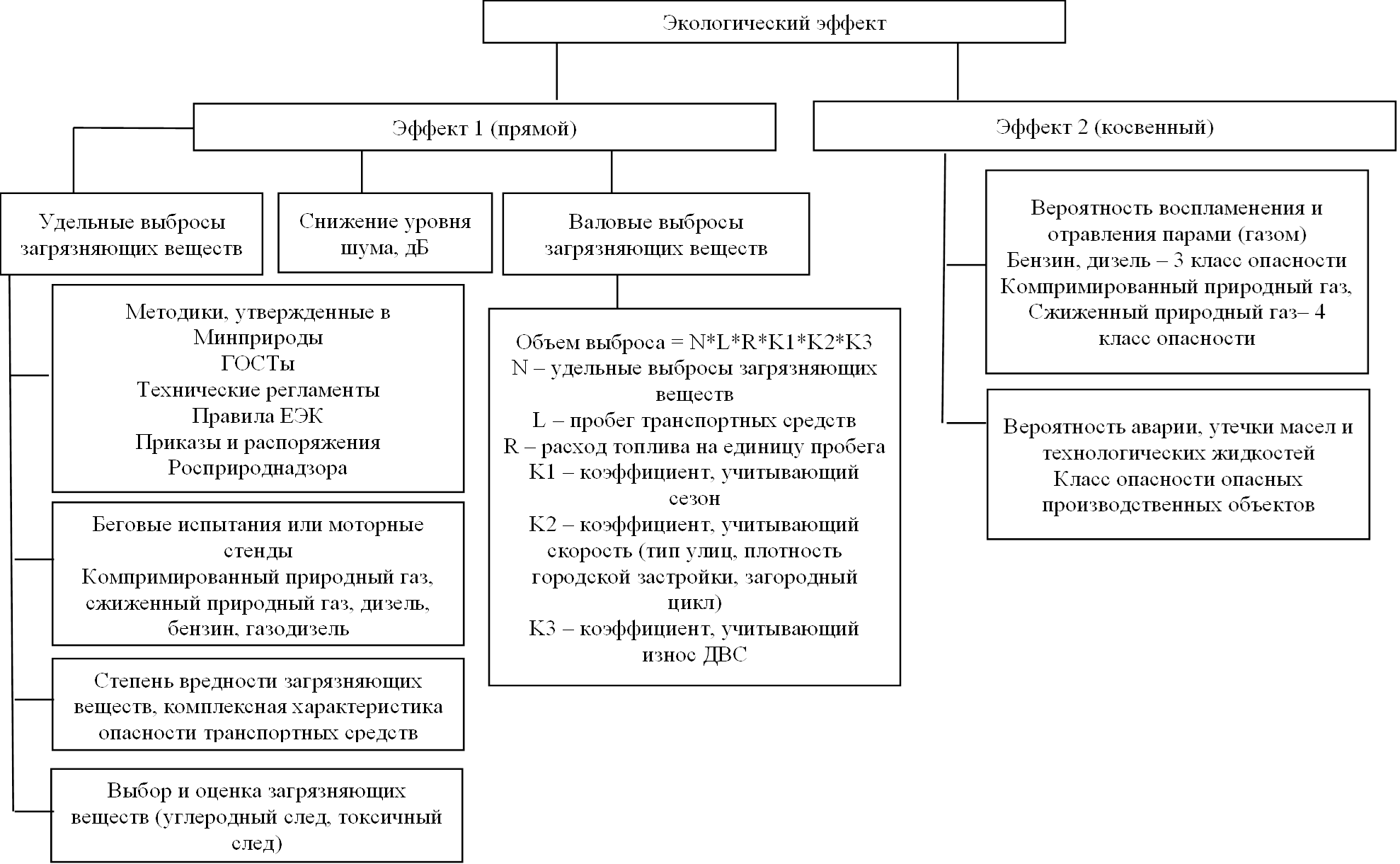 При переводе коммунальной техники на газомоторное топливо в качестве основных мы выделяем экономический и экологический эффекты. В работе будет рассмотрен экологический эффект. Под экологическим эффектом в данном исследовании будем понимать изменение выбросов загрязняющих веществ в окружающую среду при вариантах перевода коммунальной техники на газомоторное топливо. Экологический эффект будем определять от эксплуатации подвижного состава коммунальной техники на газомоторное топливо по сравнению с эксплуатацией подвижного состава коммунальной техники на традиционных видах топлива (прямой эффект), а также эффект, наблюдаемый при переводе коммунальной техники на газомоторное топливо, связанный с созданием и поддержанием необходимой инфраструктуры (косвенный эффект). Принципиальная схема определения экологического эффекта представлена на рисунке 2.