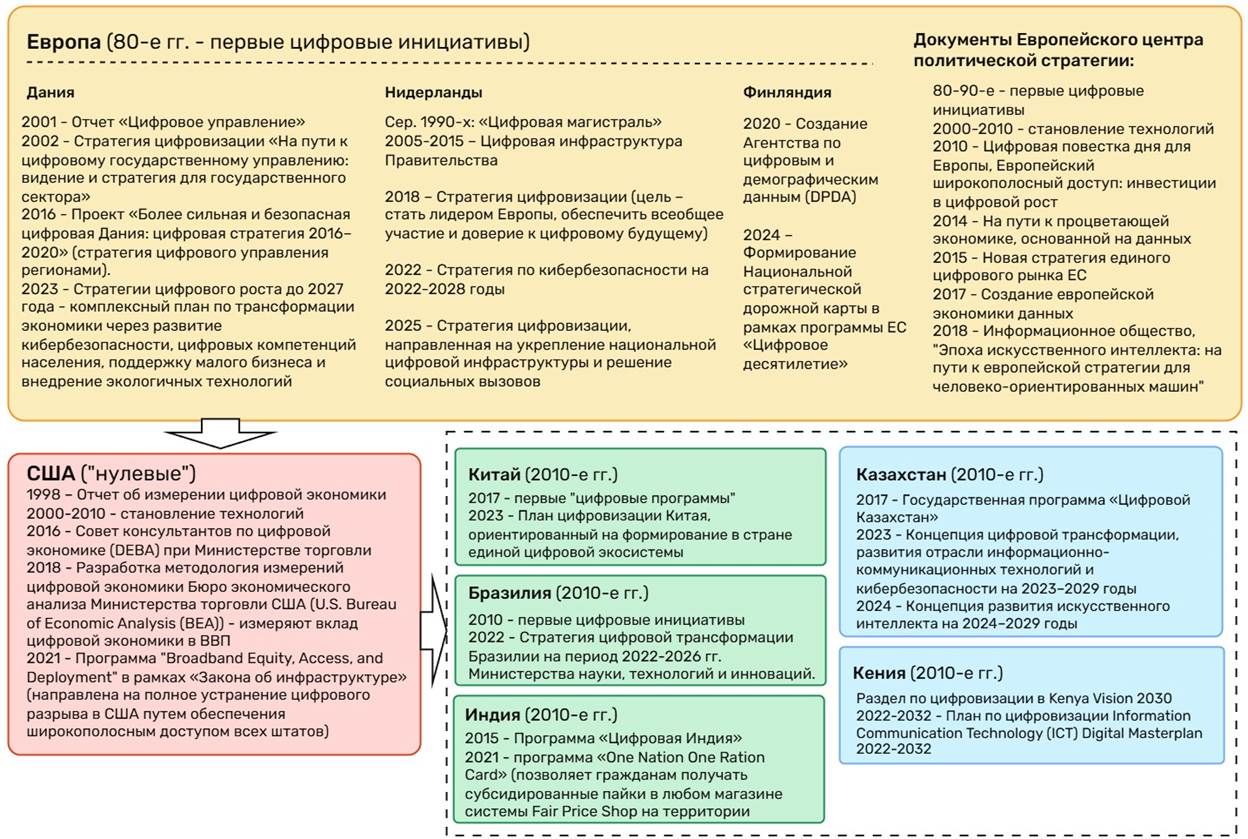 Хронология основных нормативно-правовых актов в данной области началась в европейских странах, в частности в Германии, родоначальнице Индустрии 4.0. В США первые цифровые инициативы были начаты позднее, в «нулевых» и «десятых», однако оперативность и эффективность внедрения цифровых технологий обеспечило стране технологическое превосходство и суверенитет. Китае, Бразилии, Индии, странах СНГ и Африки цифровые инициативы начали внедряться с 2010 года, но оперативность и порядок внедрения, исходная ресурсная база были различными, что проявилось в разных результатах цифровизации указанных государств.