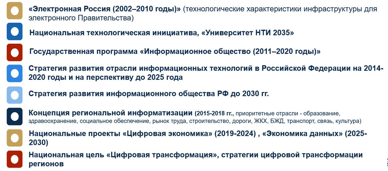 В России развитие цифровых инициатив началось в «нулевые», как и в США, с программ «Электронная Россия», «Информационное общество» (рис. 3). С 2019 года стартовало две серии национальных проектов в области цифровизации «Цифровая экономика» (2019–2024 гг.) и «Экономика данных». Интенсивность вводимых преобразований в нашей стране характеризуется как достаточно высокая, что определило достойные позиции в мировых рейтингах.