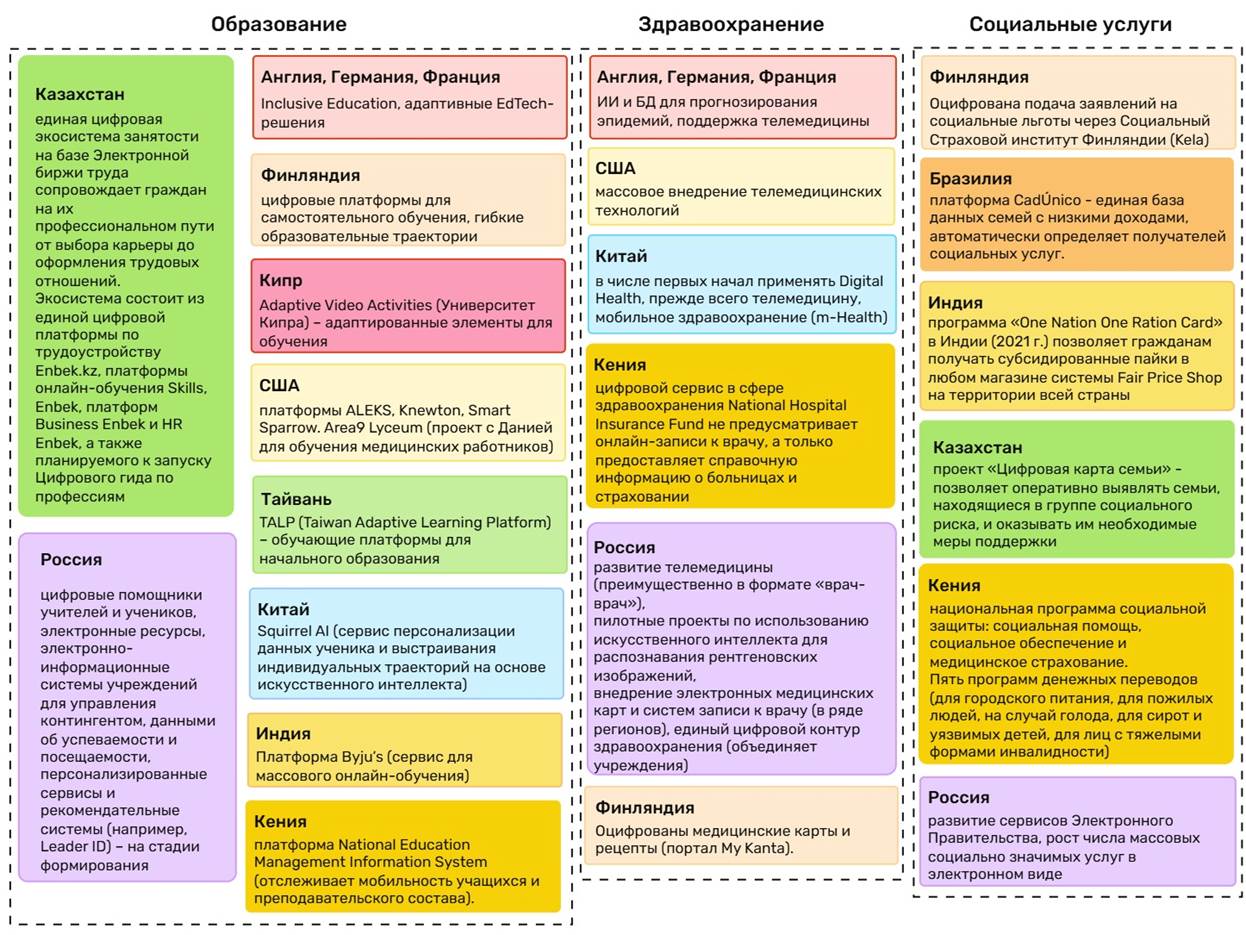 Как можно видеть, больше всего цифровых инициатив в странах мира реализуется в сфере образования (цифровые платформы для самостоятельного обучения, цифровые образовательные ресурсы для педагогического состава, рекомендательные системы по образовательным траекториям и пр.). В области здравоохранения в мировой практике используют прогностические модели с использованием искусственного интеллекта, развивают мобильное здравоохранение, электронные медицинские карты, телемедицинские услуги и пр. В области социальных услуг внедряют сервисы электронного Правительства (по аналогии с единым порталом государственных услуг в России), программы социальной помощи, платформы для осуществления платежей нуждающимся.