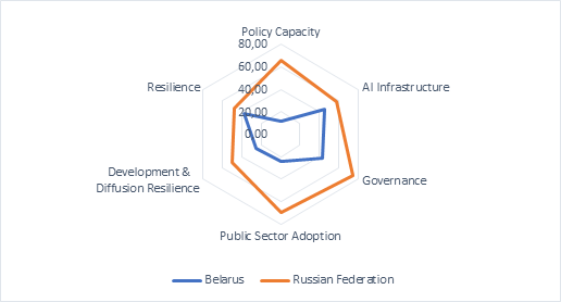 По Индексу готовности к искусственному интеллекту (Oxford insights) ситуация аналогичная: Республика Беларусь находится на 121 позиции, Российская Федерация — на 49-й [20]. Причем наибольший разрыв наблюдается по показателям политический потенциал и внедрение в государственном секторе (рисунок 2).