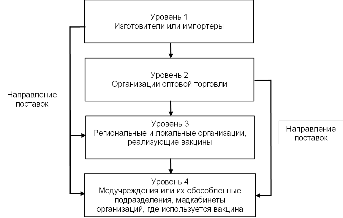 1) первый уровень – от отечественных производителей или импортеров вакцины доставляются до организаций оптовой торговли федерального масштаба;