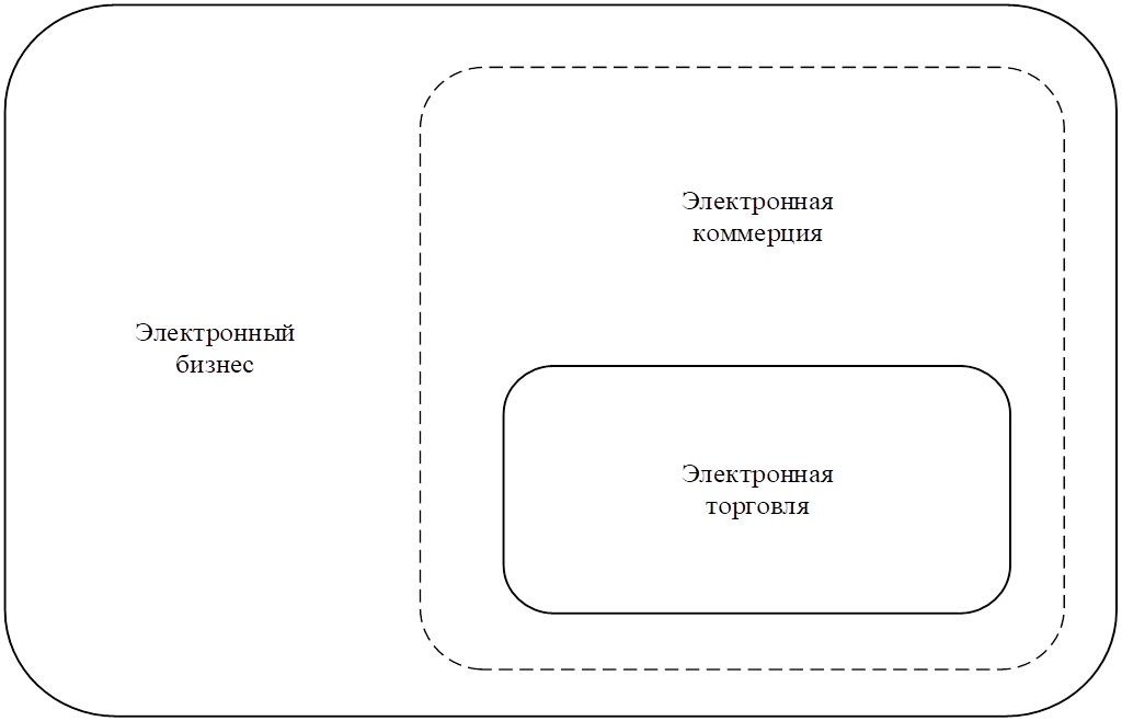 В результате проведённого анализа можно заключить, что термин «электронная коммерция» довольно размыт и часто смешивается с другими понятиями, такими как «электронный бизнес», и «электронная торговля». При этом внутри массива дефиниций прослеживается устойчивая логика. Так, «электронный бизнес» выступает в качестве более широкого понятия, а «электронная торговля» более узким. «Электронная коммерция» же занимает промежуточное положение, смещаясь в разных подходах либо в сторону торговли, либо в сторону организационного понимания к электронному бизнесу. Структура и иерархия указанных понятий представлены на рисунке 1.