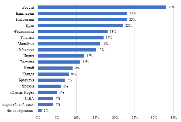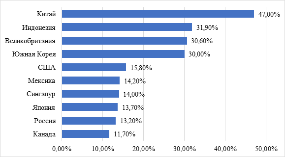 Показатель проникновения электронной коммерции представляет собой долю онлайн-канала продаж в общей рознице. Так, согласно данным, представленным на рис. 2, максимальное проникновение демонстрирует лидер рынка Китай с показателем в 47,0%, далее следуют Индонезия с показателем в 31,9%, Великобритания с показателем в 30,6% и Южная Корея с показателем в 30,0%. США при этом имеют более скромные данные, в частности, величина показателя проникновения электронной коммерции составляет 15,8%, Японии – 13,7%, России – 13,2% и Канады – 11,7%.