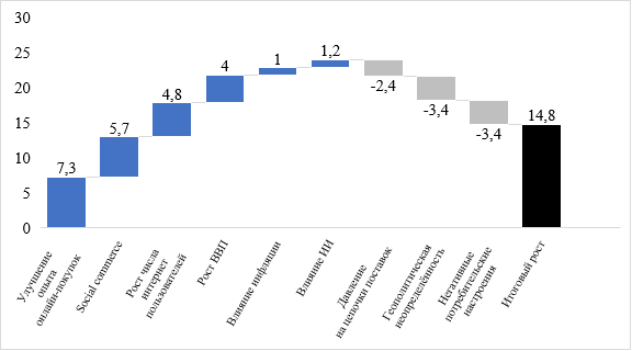 В сумме положительные и отрицательные эффекты дали положительный рост выручки мирового рынка электронной коммерции в размере 14,8%.