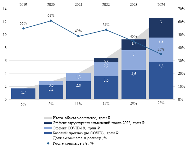 В период ограничений и самоизоляции COVID-19, когда часть офлайн-точек временно закрывалась или работала с ограничениями, перемещения и посещение торговых объектов усложнялись, а привычные сценарии покупки часто становились недоступными, онлайн канал для многих стал фактически вынужденной альтернативой. В таких условиях спрос сместился в онлайн, прежде всего в категории повседневного потребления. После снятия ограничений потребительские привычки остались. Соответствующие данные, подтверждающие вышесказанное, представлены на рисунке 5. По данным консалтинговой компании «Яков и Партнёры» [26], за 2019–2024 гг. объем рынка электронной коммерции в Российской Федерации вырос примерно в 7,1 раза, а доля e-commerce в общем объеме розничной торговли увеличилась с 5% до 23%, при этом, эффект от пандемии COVID-19 составил 3,8 трлн рублей или 30%, а эффект от структурных изменений рынка после 2022 года — 3 трлн рублей или 23% от общего объема рынка.