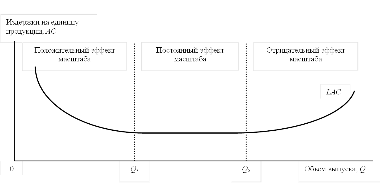- положительный эффект масштаба (экономия на масштабе), при котором наблюдается снижение средних (удельных) издержек на производство единицы продукции по мере роста общего объема выпуска;