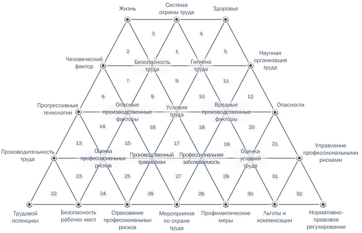 Модель системы охраны труда представляет относительно упорядоченное категориально-понятийное поле с базовой триадой «1», вершиной которой является понятие «система охраны труда» и ребрами триадной сети «безопасность труда» и «гигиена труда», определяют дальнейшие связи между парами соседних категорий, объединенные триадами «2», «3», «4», «5», являющимися вершинами триадной сети, и формирующих исследуемую предметную область. Выделенные автором категории и понятия связаны между собой связями 1-го, 2-го и далее уровнями, которые формируют микро- (отдельные категории и понятия), макро- (триады категорий и понятий), мезо- (комплексы триад категорий и понятий), и мега- (триадическая сеть в целом) уровни знаний об объекте исследования (рис.1).