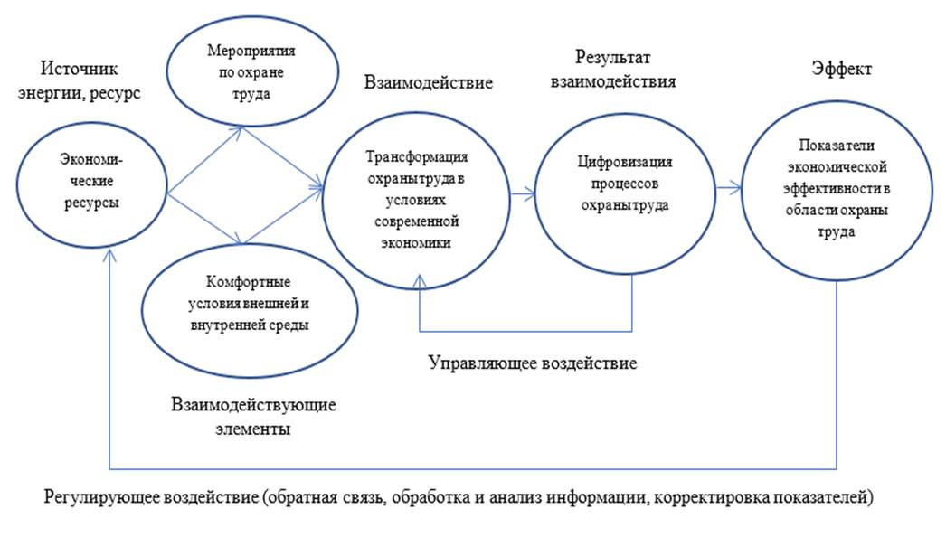 Входные данные являются управляющими и представляют собой количественный и качественный состав системы охраны труда. Внешние воздействия на систему охраны труда проявляются в виде процесса трансформации, выраженной в преобразовании элементов системы охраны труда в виде определенных действий по совершенствованию и развитию организационной, производственной, технико-технологической, экономической, социальной, управленческой структур на микро- и макроэкономическом уровнях. Результатом взаимодействия всех элементов в системе охраны труда в современной экономике будет являться цифровизация процессов охраны труда, позволяющих снижать уровни профессиональных рисков, производственного травматизма, профессиональной заболеваемости работников, что, в свою очередь, приведет к росту показателей производительности труда, прибыли предприятий, рентабельности производства, а также к улучшению условий труда и повышению уровня культуры безопасного труда.