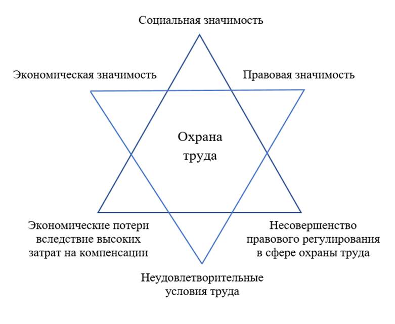 На основе сопоставления проблемных и значимых аспектов функционирования системы охраны труда сформирована авторская модель взаимосвязанных проблем и аспектов с использованием категориально-символьного метода «гексаграмма», определяющая необходимость разработки целостной концепции развития системы охраны труда в современной экономике. Полученная модель позволила выявить сущность, содержание и проблематику охраны труда как управляемой системы, позволяющей воздействовать на противоречия и находить эффективные режимы ее совершенствования и развития в современной экономике.