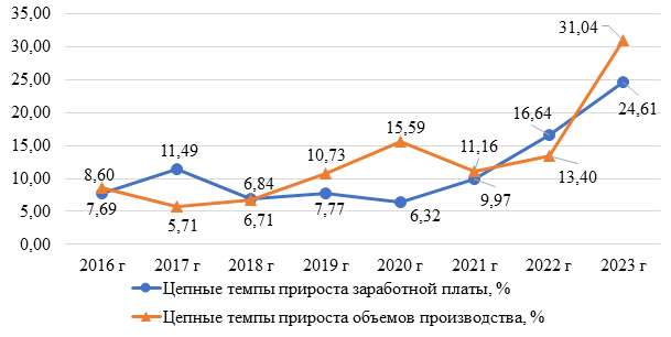 Одной из них является несоответствие темпов роста заработной платы и темпов роста объемов производства в отрасли (рисунок 1).