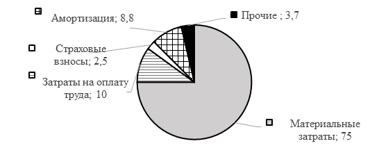 Представленная на рисунке 2 структура затрат, формирующих себестоимость продукции, свидетельствует о преобладающей доле материальных затрат (75%).