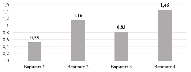 Приведенные в таблице 1 показатели свидетельствуют о неоднозначности данного проекта с экономической точки зрения. В частности, очевидно, что только второй и четвертый варианты обеспечивают положительный NPV: 5,2 млн рублей и 15 млн рублей соответственно. Учитывая значительную величину капитальных затрат, при принятии управленческого решения важны относительные показатели. Исходя из экономической сущности индекса доходности (PI), очевидно, что данный показатель должен превышать единицу, а в данном проекте (рисунок 4) даже четвертый вариант приносит всего один рубль 46 копеек чистого приведенного дохода на рубль затрат.