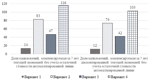Рисунок 8. Доля капитальных вложений, компенсируемая за 7 лет без учета остаточной стоимости автоматизированной линии, %