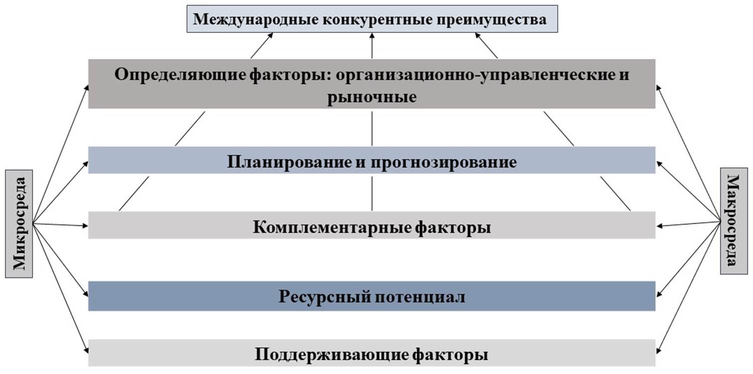 Конкурентные преимущества представляют собой экономическую категорию, обозначающую наличие у компании, отрасли или страны уникальных характеристик, которые отличаются от аналогов и обеспечивают превосходство в конкуренции. Данный феномен был изучен в XX веке с точки зрения экономических преимуществ стран, начиная от географии до количества работающего населения. Портер Майкл Юджин, активно изучавший конкурентные преимущества стран мира в конце XX века, описал новую модель глобальной конкуренции, которая основывалась на активном изменении преимуществ бизнеса, а не на особенностях свойств географического расположения стран [1]. Исходя из его представлений, конкурентные преимущества определенных государств в ряде ведущих отраслей промышленности образуются благодаря качеству факторов рабочей силы, инфраструктуры, спросу на внутреннем рынке и мощью поддерживаемых отраслей. Описание анализа наиболее развитых стран мира и выявление характерных преимуществ их состояния экономического роста, позволило Портеру М. выявить то, что национальная производительность является второстепенным звеном, которое следует за конкурентоспособностью предприятий. Модель «Алмаз Портера» включает в себя четыре ключевых элемента, влияющих на конкурентные преимущества: стратегия фирмы, структура и соперничество; условия спроса; факторные условия; смежные и вспомогательные отрасли [1]. Помимо этого, данные четыре фактора взаимодействуют друг с другом, а также на их развитие влияют случайность и политика государства. В научной практике теорию конкурентных преимуществ Портера М. рассматривают как отдельную сферу исследования или в разрезе международной конкурентоспособности стран.