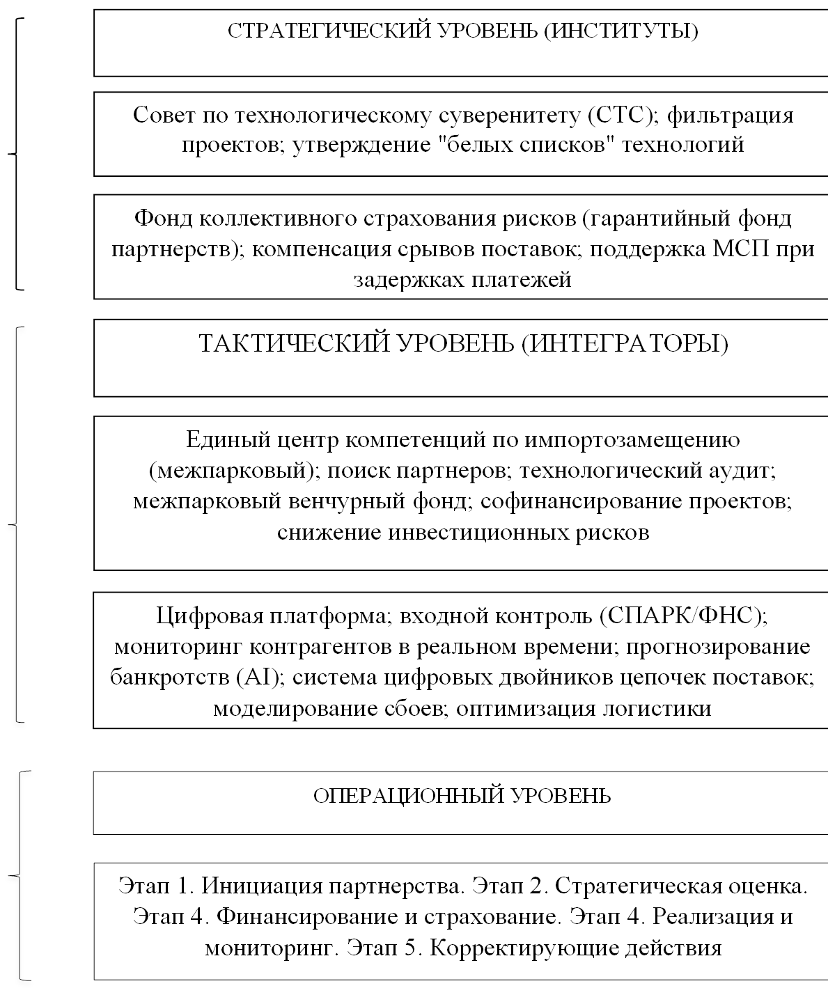 Модель строится на трех уровнях управления (стратегический, тактический, операционный) и реализует принцип «Безопасность через развитие», то есть механизмы партнерства не просто контролируются службами безопасности, а сами встроены в процесс снижения рисков (например, совместные НИОКР снижают зависимость от импорта, а центры коллективного пользования уменьшают издержки).