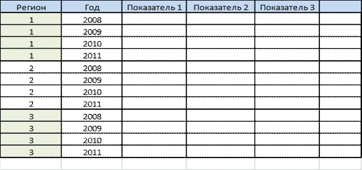 При формировании панельных данных по регионам России, например за 2008-2011 годы, таблица должна иметь следующую структуру, представленную на Рисунке 3