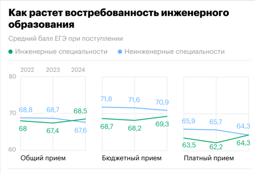 В 2024 году на инженерные направления в российских вузах было принято 228,6 тыс. человек — 41% от общего приёма в вузы, что соответствует показателям советского периода. Среди направлений подготовки, демонстрирующих рост, значительную долю (37%) составляют инженерные специальности, что иллюстрирует информация исследования, проведенного НИУ ВШЭ по мониторингу качества приема в вузы. [9].