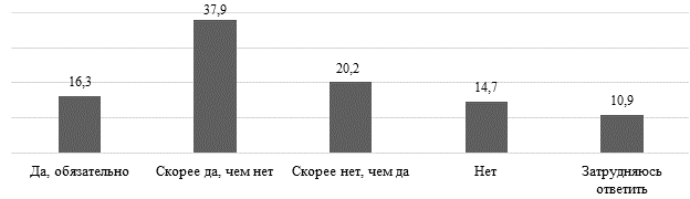 На уровне всей выборки (n = 2491) установлено, что более половины студентов – 54,2% – заявили о готовности участвовать в мероприятиях, направленных на развитие студенческого предпринимательства (16,3% – «обязательно», 37,9% – «скорее да»). Сдержанную позицию выразили 34,9% («скорее нет» и «нет»), а ещё 10,9% затруднились ответить (рисунок 1).