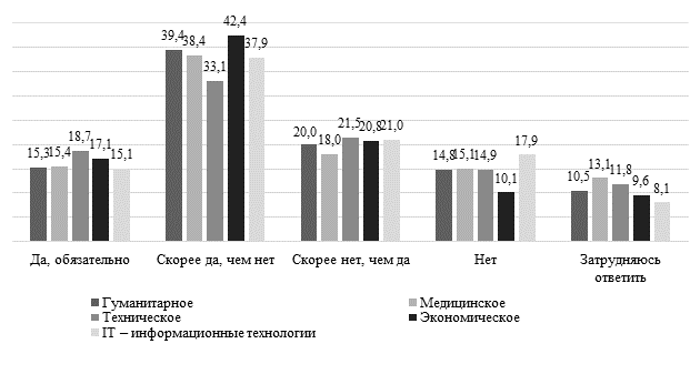 Разбивка по образовательным направлениям позволяет отметить, что максимальная доля положительно настроенных студентов зафиксирована в экономических и IT-направлениях: 59,5% и 53% соответственно. Наименьшая вовлечённость характерна для студентов технических специальностей (51,8% положительных ответов). Среди студентов гуманитарных и медицинских направлений доля поддержки участия превышает 54%, что близко к среднему уровню (рисунок 2).
