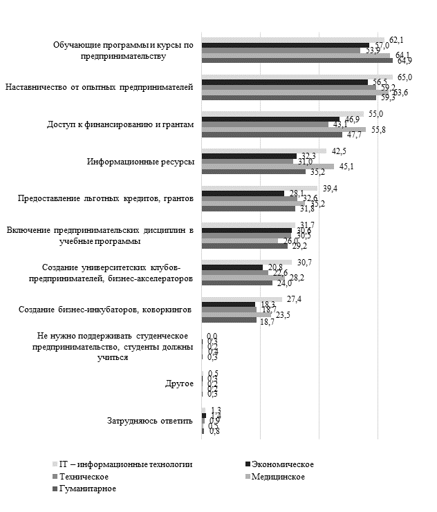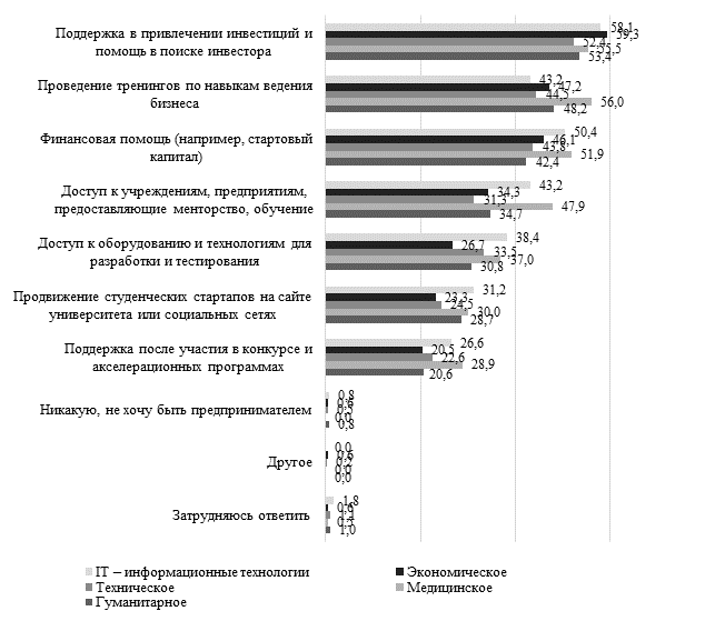 Рисунок 3. Распределение ответов респондентов на вопрос «Что, по Вашему мнению, необходимо для поддержки студенческого предпринимательства в Вашем университете?», в разрезе направлений обучения, в процентах