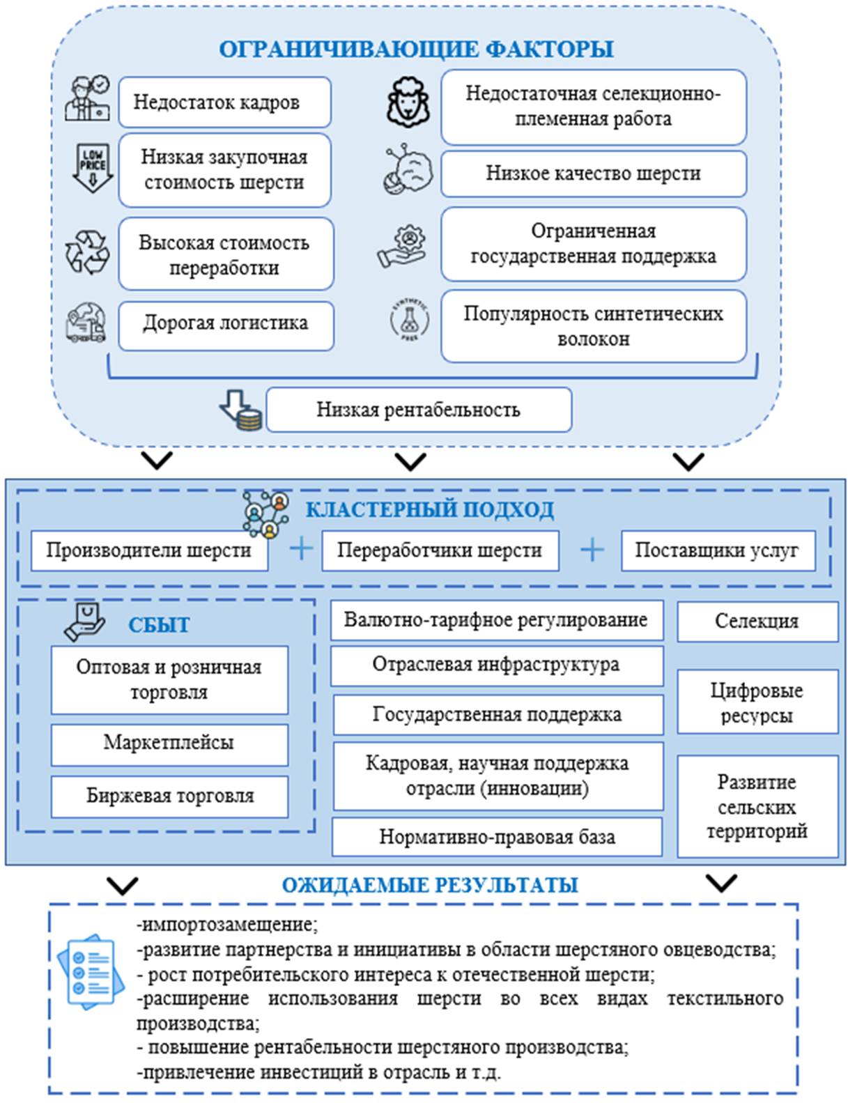 Предложенная модель учитывает необходимость кластерного подхода к производству шерсти, что отмечено как одно из приоритетных направлений в комплексной стратегии развития шерстяной промышленности, которая реализуется с 2024 года.