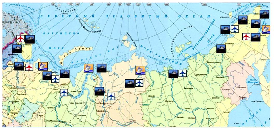 Рисунок 1. Опорные точки транспортной системы Арктической зоны России и перспективной инфраструктуры