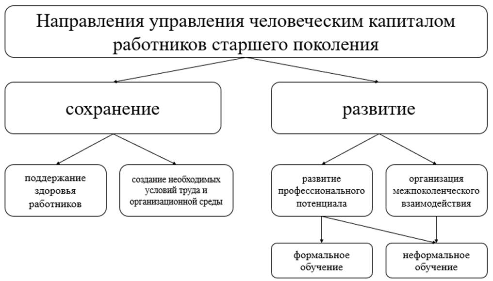 Первые два направления в большей степени ориентированы на сохранение человеческого капитала работников старшего поколения. Под сохранением понимается способность пожилых сотрудников поддерживать свое здоровье, мотивацию и работоспособность как в настоящем, так и в перспективе. Третье направление, связанное с использованием и развитием профессионального потенциала, в большей степени ориентировано на развитие человеческого капитала работников старшего поколения. Под развитием здесь понимается не только поддержание текущего состояния, но и достижение роста, в частности, в определённых профессиональных областях [29].