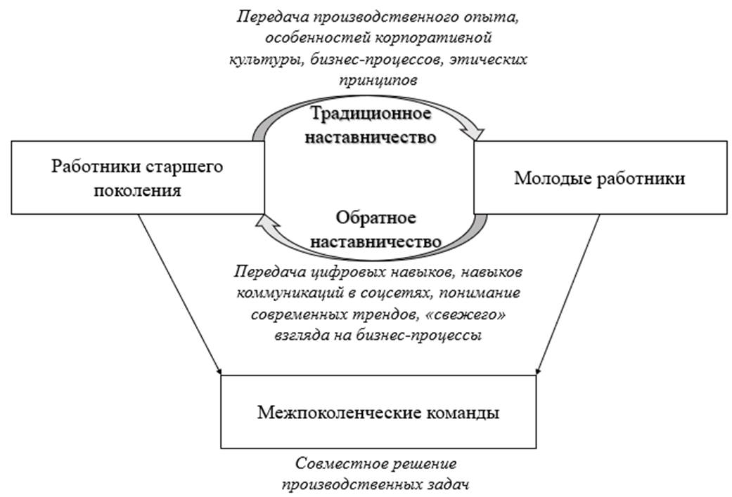 В организации трудовой деятельности на предприятии большое значение имеет межпоколенческое взаимодействие [7], поскольку оно способствует обмену знаниями, снижению конфликтов, укреплению корпоративной культуры, снижению стереотипов, повышению лояльности сотрудников разных возрастных групп и, в конечном счете, росту производительности труда. Передача опыта, навыков, восприятия корпоративной культуры старшим поколением молодым, которые в свою очередь передают навыки владения цифровыми инструментами, в итоге обеспечивают преемственность человеческого капитала, повышая тем самым адаптивность предприятий, особенно производственных, к изменениям.