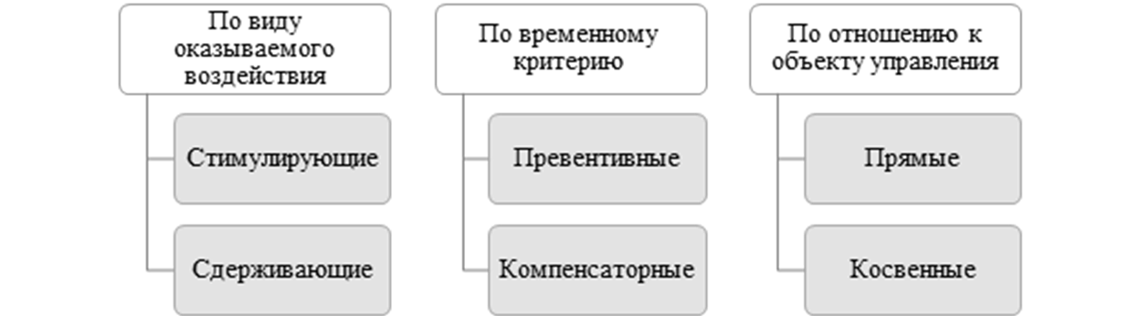 Наконец, по отношению к объекту управления инструменты могут быть подразделены на прямые, то есть оказывающие воздействие непосредственно на объект управления, и косвенные, то есть оказывающие воздействие, например, на всю отрасль без какой-либо категоризации. К первому виду инструментов представляется возможным отнести субсидии конкретным юридическим лицам, например, на возмещение части затрат, тогда как ко второму виду – льготы по страховым тарифам, которые могут быть установлены для какой-либо отрасли в целом.