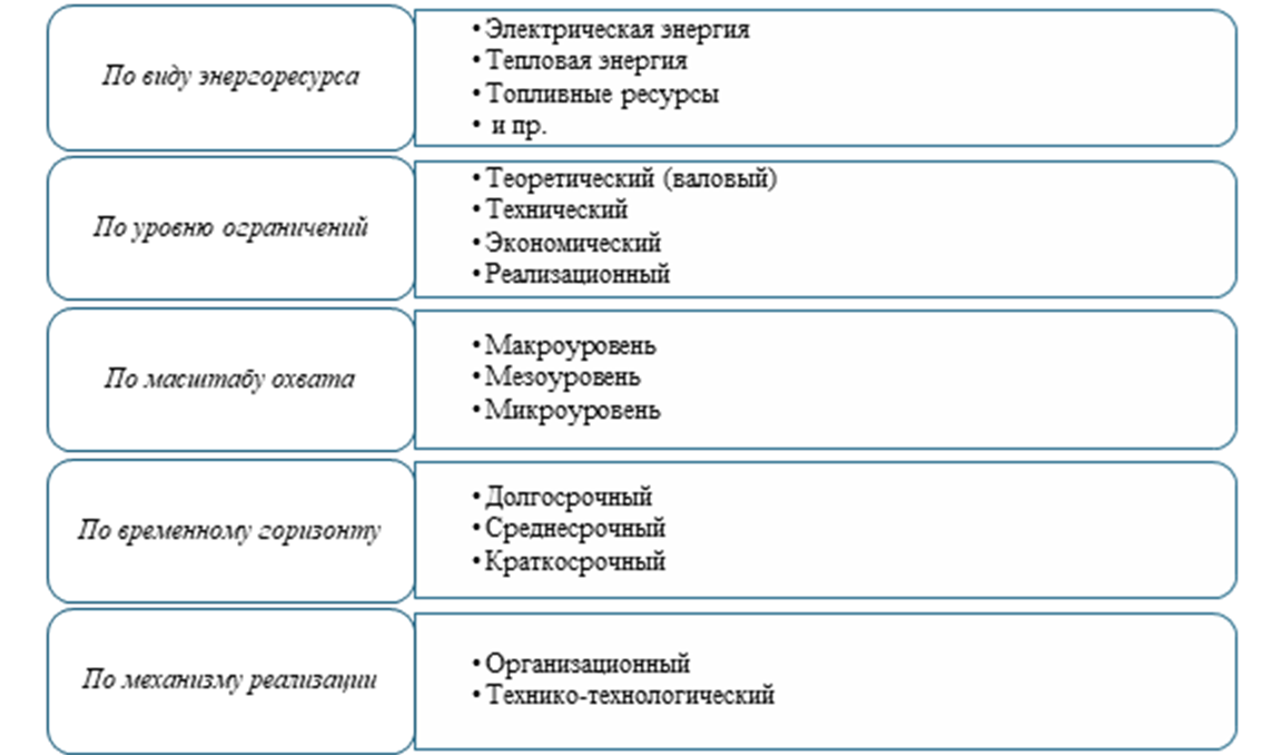 Вторым важным результатом является разработанная многокритериальная классификация потенциалов энергоэффективности. В отличие от традиционных подходов, ограничивающихся разделением на теоретический, технический и экономический потенциалы, предложенная классификация расширяет систему признаков, включая вид энергетического ресурса, виды ограничений, масштаб охвата, временной горизонт и механизм реализации. Это позволяет структурировать многообразие резервов энергосбережения и обеспечить их привязку к конкретным объектам управления и этапам планирования.