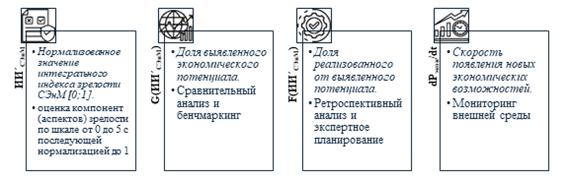 Для практической реализации модели определены методы оценки каждого компонента: нормализованный индекс зрелости рассчитывается по разработанной в исследовании методике на основе аудита по четырем направлениям; функции G и F определяются путем сравнительного анализа и ретроспективного оценивания с использованием интервальных оценок, дифференцированных по уровням зрелости; скорость прироста экономического потенциала оценивается на основе мониторинга внешней среды, включая отслеживание динамики стоимости новых технологий и прогноз изменения тарифов.
