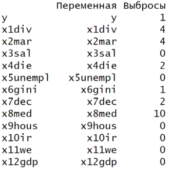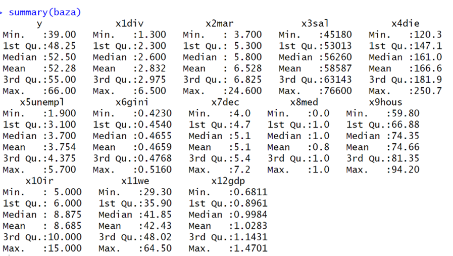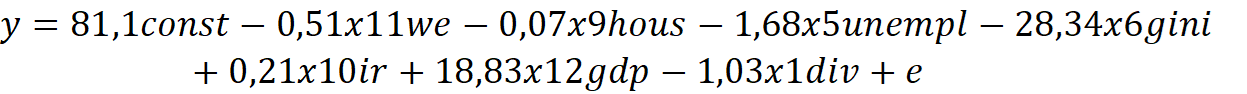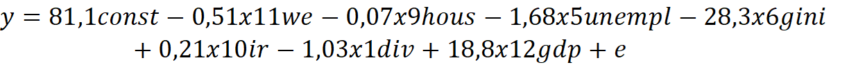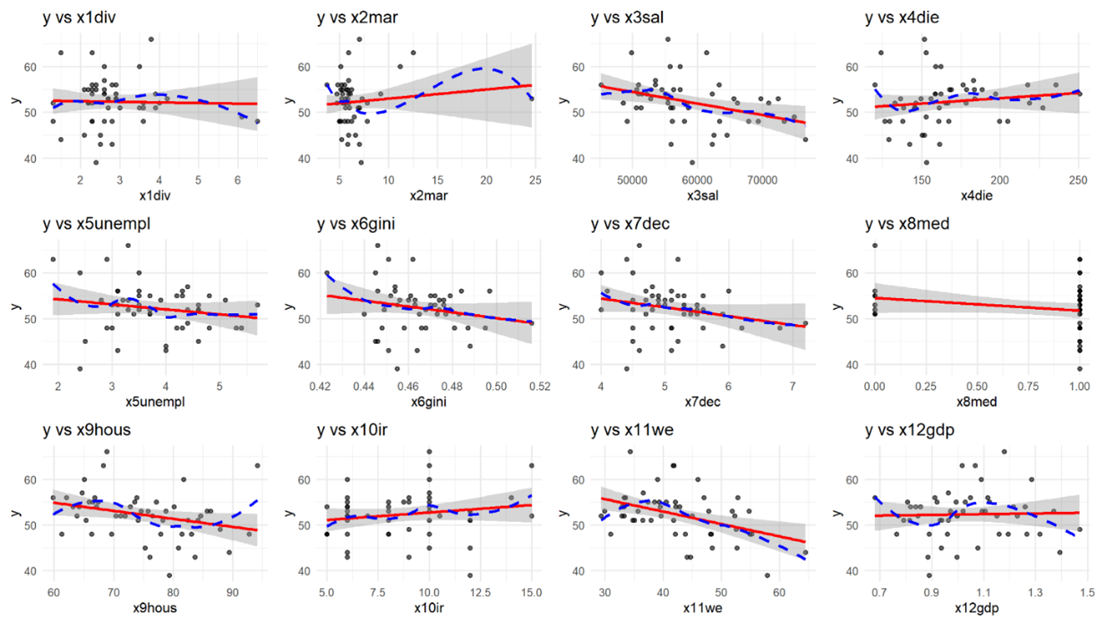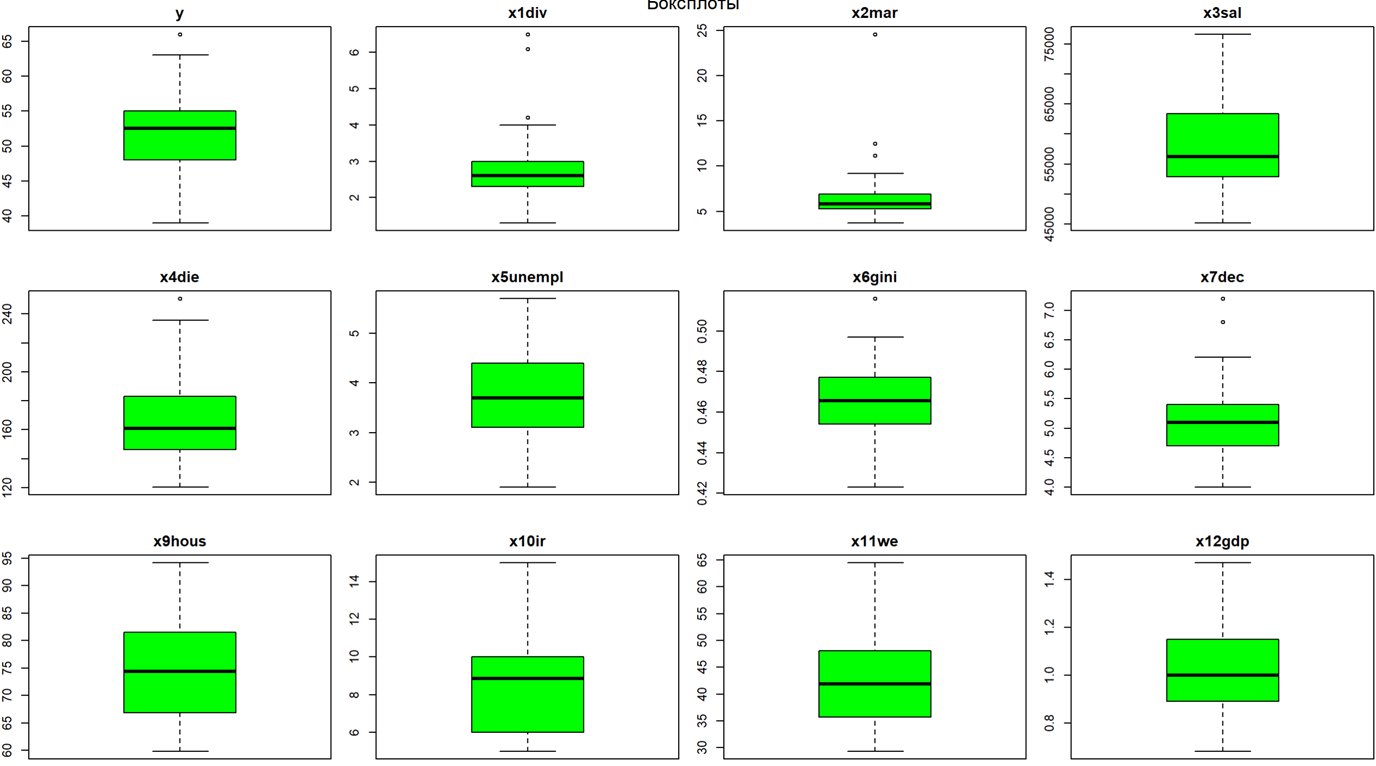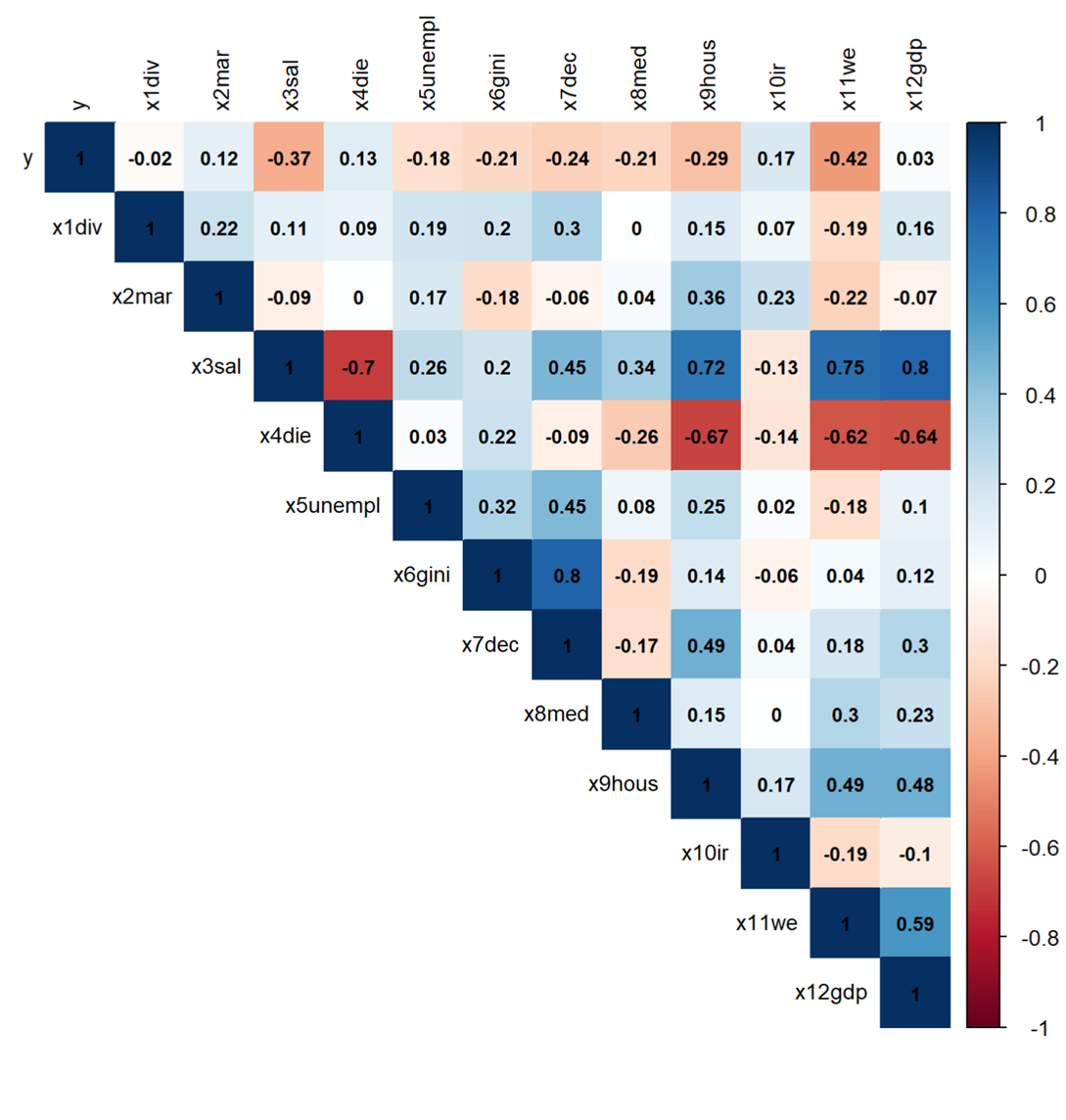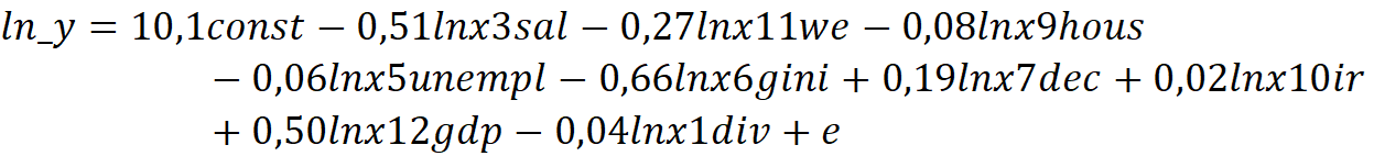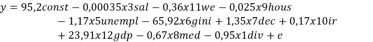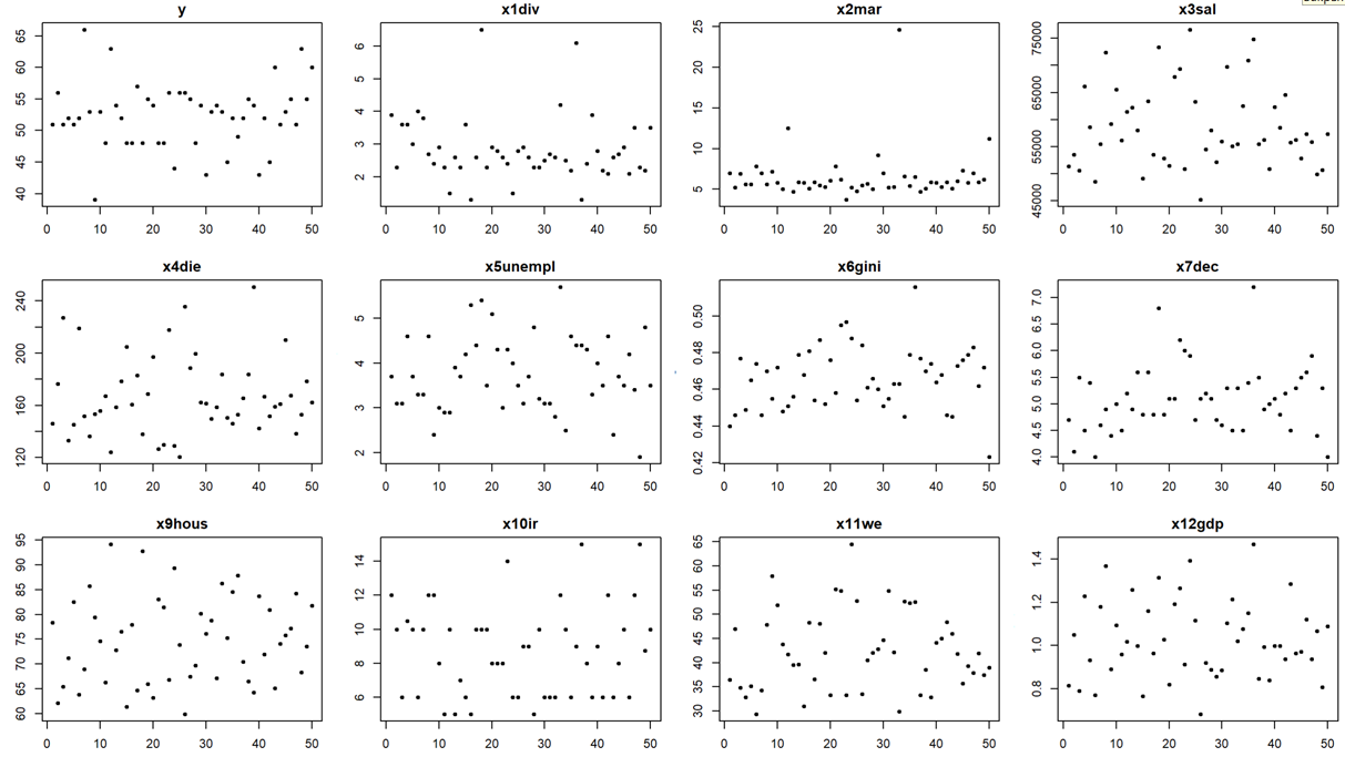 С точки зрения социально-экономической взаимосвязи, влияние регрессоров можно разделить на две группы: положительные и отрицательные. Отрицательное влияние на y оказывают количество разводов, так как этого говорит о нестабильности института семьи и нежелании иметь детей. Переменная средней заработной платы может оказывать как положительный эффект на рождаемость, так и отрицательный, поскольку, с одной стороны, рост дохода увеличивает ресурс семьи, но, также, рост зарплаты увеличивает «цену» времени, потраченного на ребенка. Переменная, которая характеризует смерть от заболеваний имеет негативный характер, поскольку говорит о низком уровне развития медицины, что также подавляет желания иметь детей, поскольку люди чувствуют медицинскую незащищенность. Переменная безработицы оказывает отрицательный эффект, поскольку от неимения денег люди не могут завести ребенка, чтобы должным образом воспитать его и дать качественное образование. У Индекса Джинни и Децильного коэффициента связь с y неоднозначная, поскольку могут снижать рождаемость из-за общей экономической неуверенности населения, но также они показателя могут и не влиять на прямую на уровень рождаемости, поскольку больший % семей, которые заводят детей – средний класс. Индекс доступности жилья может иметь как отрицательную, так и положительную связь с уровнем рождаемости, поскольку именно он указывает на способность людей иметь свое жилье, что является одной из главных предпосылок к рождению ребенка. Переменная, которая отвечает за % ставку имеет отрицательный характер при росте, поскольку в таком случае стоимость жилья увеличивается. И наконец, переменная, отвечающая за женское образование также неоднозначна, поскольку при её росте может как увеличиться доход, необходимый для воспитания ребенка, также и снизиться желание заводить детей из-за нехватки времени. Переменные, определяющие количество браков и относительный ВВП имеют положительный эффект, поскольку увеличивают вероятность рождения детей.