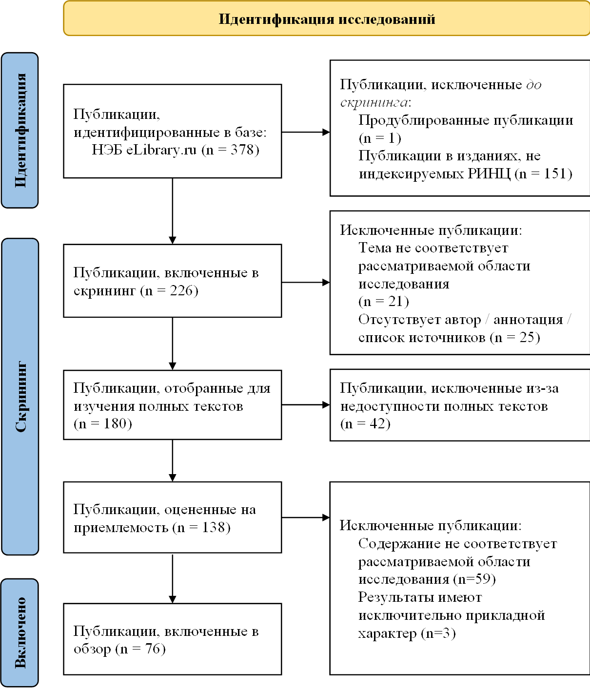 Первичный поисковый запрос сформировал выборку из 378 публикаций. В результате отбора в обзор включены 76 статей (рис. 1).