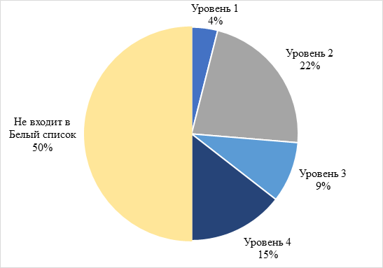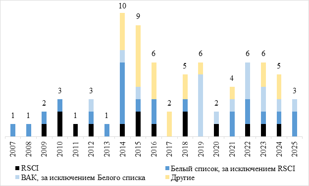 Половина статей опубликована в изданиях, которые не вошли в Белый список 2025 г. (рис. 3). Только 3 статьи, составляющие 4%, включены в журналы первого уровня Белого списка. Это журналы «Балтийский регион», «Экономика, труд и управление в сельском хозяйстве» и «Экономическая социология». Наибольшее количество публикаций (10 из 76) приходится на журнал «Экономика сельскохозяйственных и перерабатывающих предприятий», который имеет второй уровень в Белом списке, а также входит в ядро РИНЦ, а именно RSCI. Всего в рамках обзора в журналах из ядра РИНЦ опубликованы 15 статей из итоговой выборки.