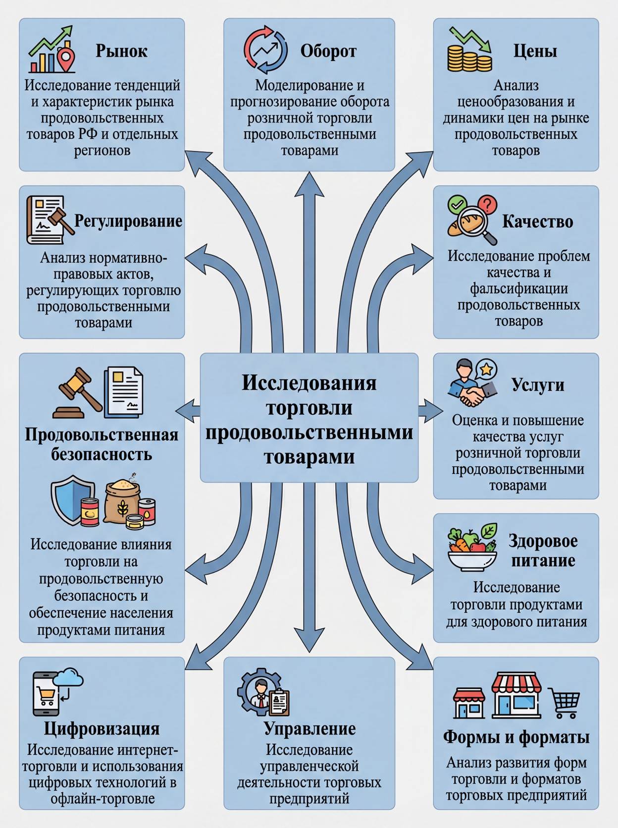 Представленные направления взаимосвязаны. Например, интернет-торговля рассматривается как одна из форм торговли и в контексте цифровизации отрасли; работы по ценообразованию вошли в отдельно выделенный блок «Цены», а также в блок исследований управленческих проблем на микроуровне; в свою очередь анализ цен, товарооборота является частью анализа рынка продовольственных товаров. Все тематические направления актуальны и практически значимы, целесообразность проведенных исследований не вызывает сомнений.