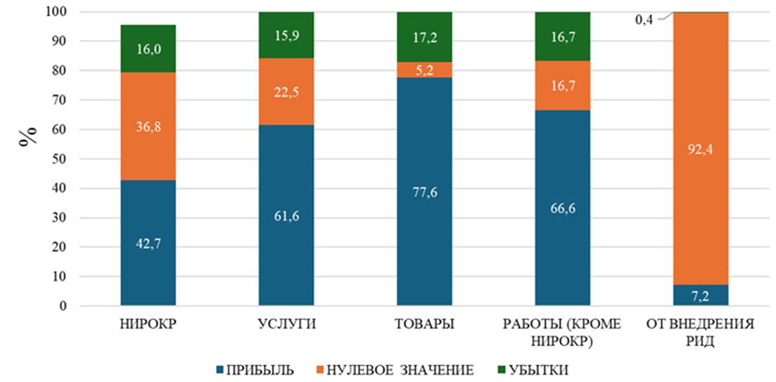 Следует отметить, что задачи, решение которых способствовало бы развитию технологического суверенитета, всегда оставались актуальными для высших учебных заведений (ВУЗ), и в этом направлении была проделана большая работа. Так, в России, по данным Министерства образования и науки Российской Федерации, зарегистрировано 5 тысяч университетских стартапов с общей выручкой 2,8 млрд руб., запущен проект «Платформы университетского технологического предпринимательства», объединяющий проекты Минобрнауки и п Минэкономразвития «Взлет − от стартапа до IPO» [8]. В настоящее время в базу данных о действующих малых инновационных предприятиях (МИП) включено 1113, причем из них 233 учреждения системы Минобрнауки России создали 889 МИП [19]. Однако результативность научных исследований низкая. Прибыль не превышает 0,4%, а нулевая прибыль [1] составляет 92, 4% (рис. 1).