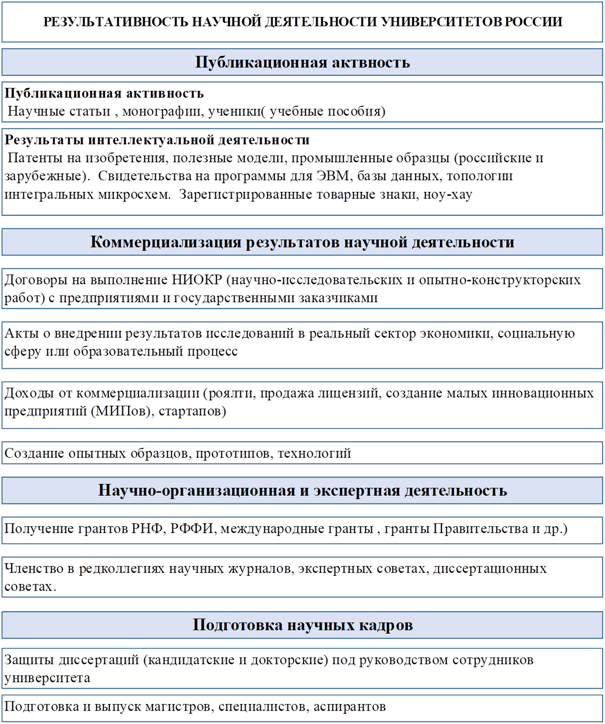 The article discusses the effectiveness of universities' research activities and mechanisms for increasing the transfer of theoretical research results into products in demand by industry. An analysis of the policy in the field of science and education has shown that this area has always been a priority of the state, despite the negative results of the implemented strategy of economic re-equipment based on imported technologies in the early 2000s. The phased deployment of infrastructure at universities for the implementation of scientific research with the support of the state, the integration of the educational sphere with business, and a comparative analysis of achievements using ranking systems both within universities and at the international and national levels reversed the negative trend in the development of university science, when personnel training tasks were mainly solved.