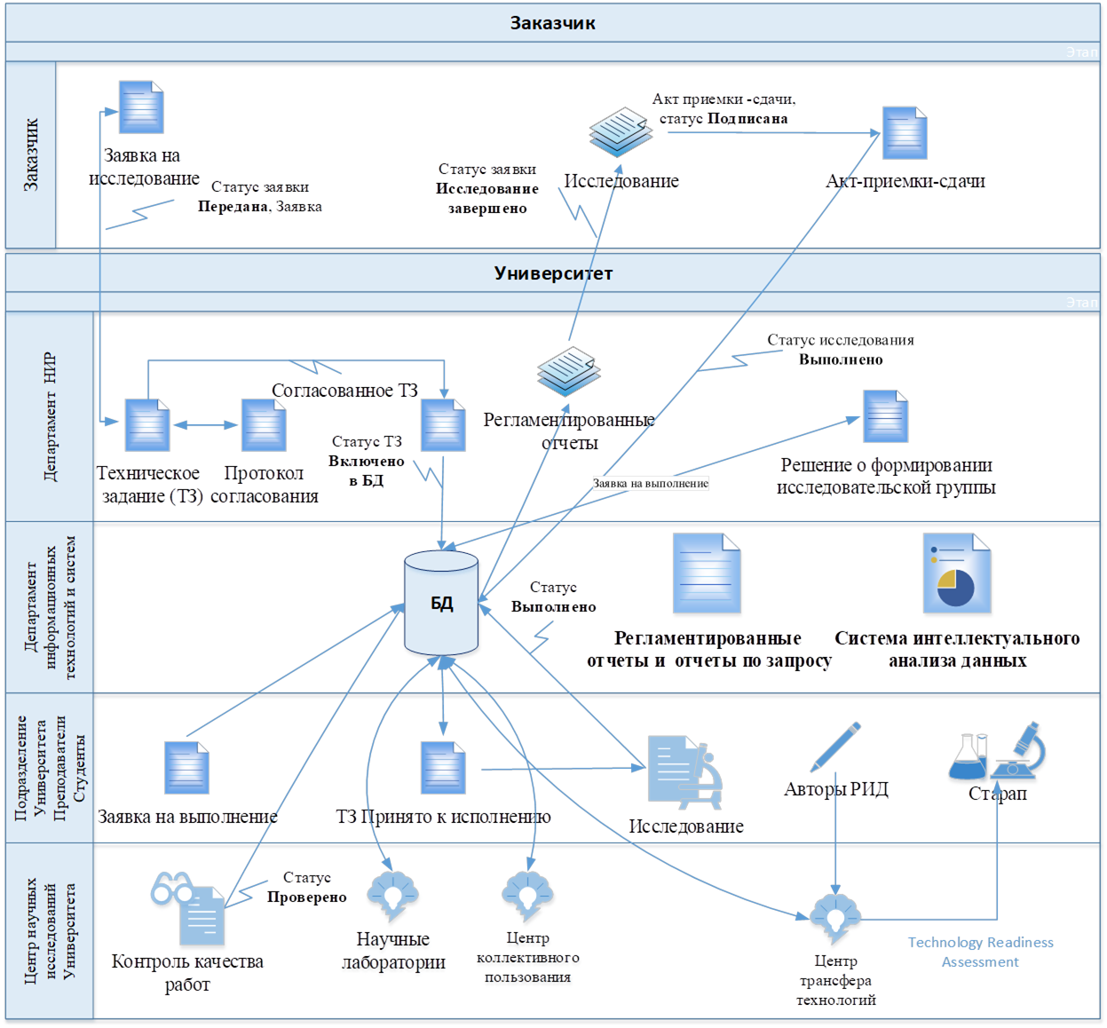 Вся информация от заказчика и других участников процесса фиксируется в базе данных (БД). Наличие заявок от внешних и внутренних заказчиков доступно преподавателям, научным лабораториям и кафедрам, что позволяет каждому участвовать в конкурсе на выполнение исследований. Такой подход обеспечивает формирование команды исполнителей, обладающей необходимыми компетенциями для выполнения НИОКР по заявке заказчика. Необходимые каналы коммуникации для возможности использования оборудования или технологий Центров коллективного пользования, консультаций сотрудников научных лабораторий также реализуются внутри интегрированной системы в соответствии с действующими регламентами.